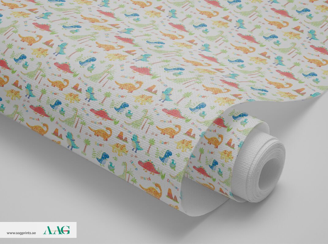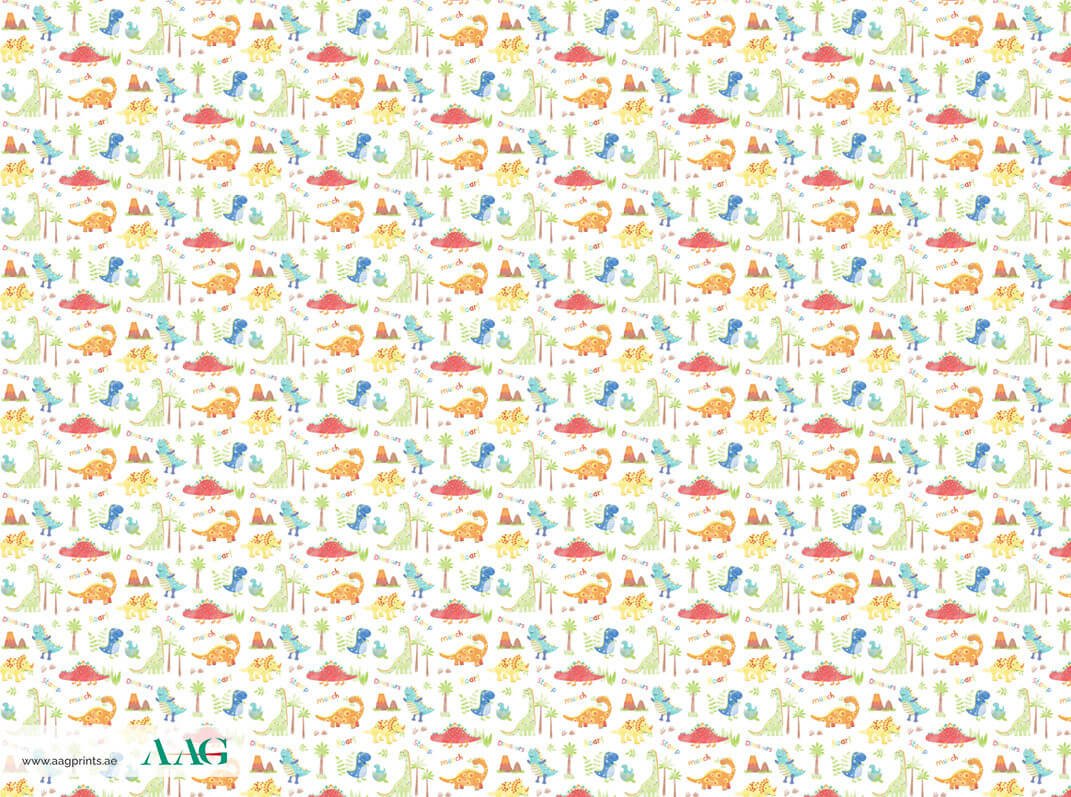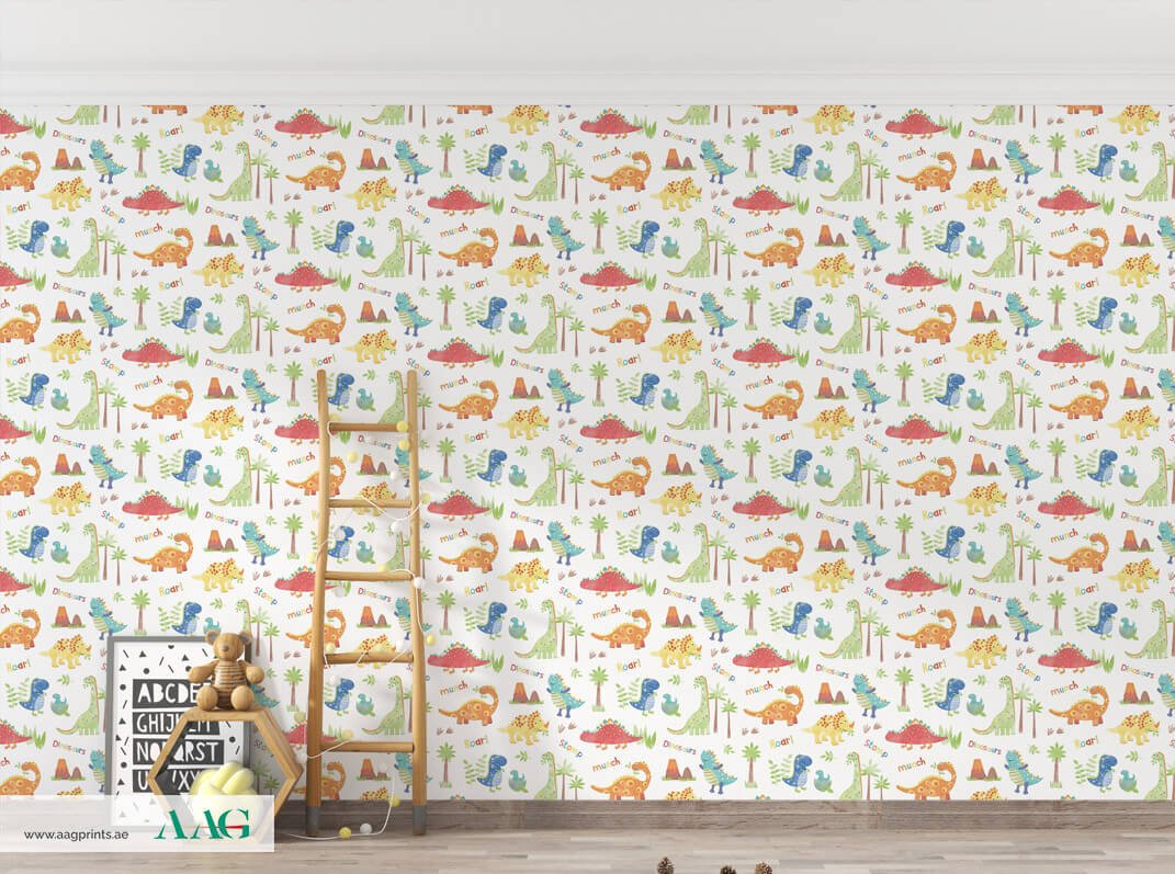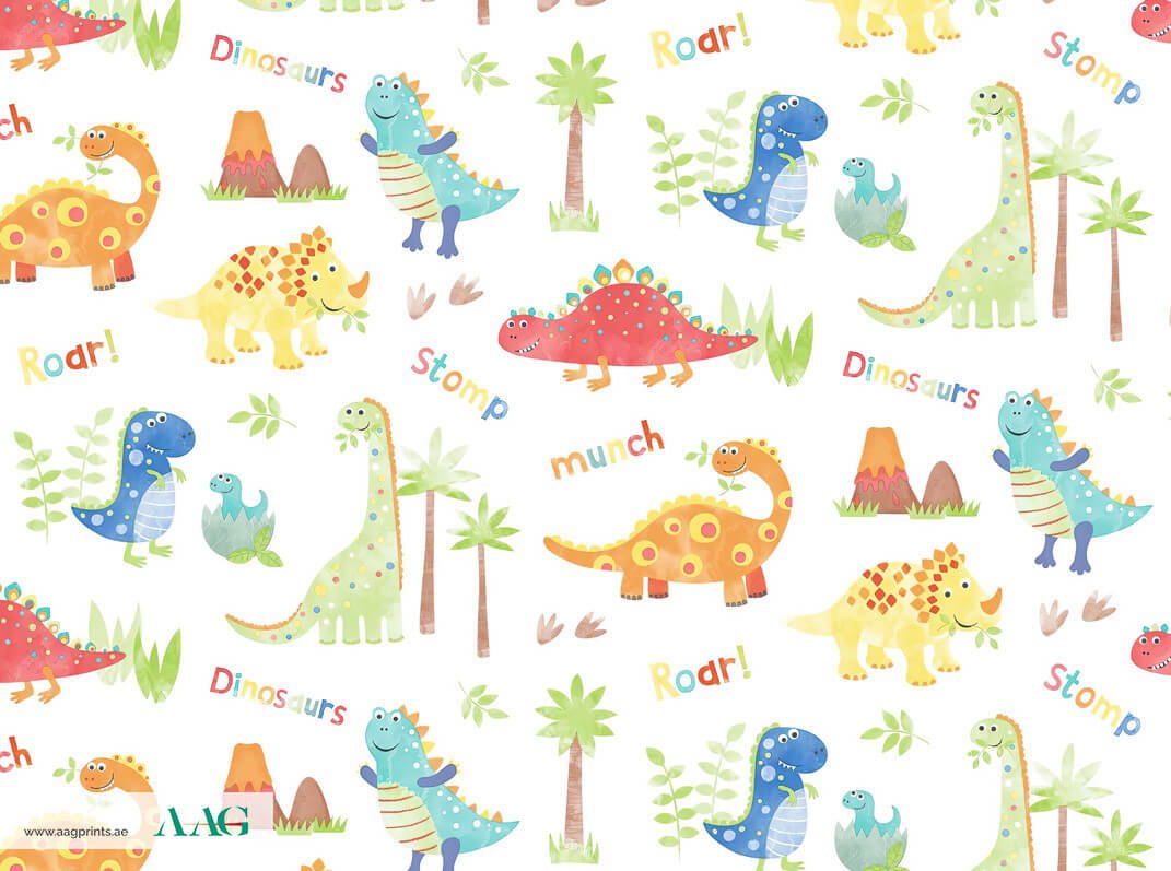 A variety of endearing, cartoon-like dinosaurs in cheery tones of red, blue, green, and orange fill this vivid, repeating pattern. Set against a vivid white backdrop, the fun creatures are dotted with tiny, stylized palm trees and delicate squiggles, producing a vibrant and captivating pattern ideal for a child's room.