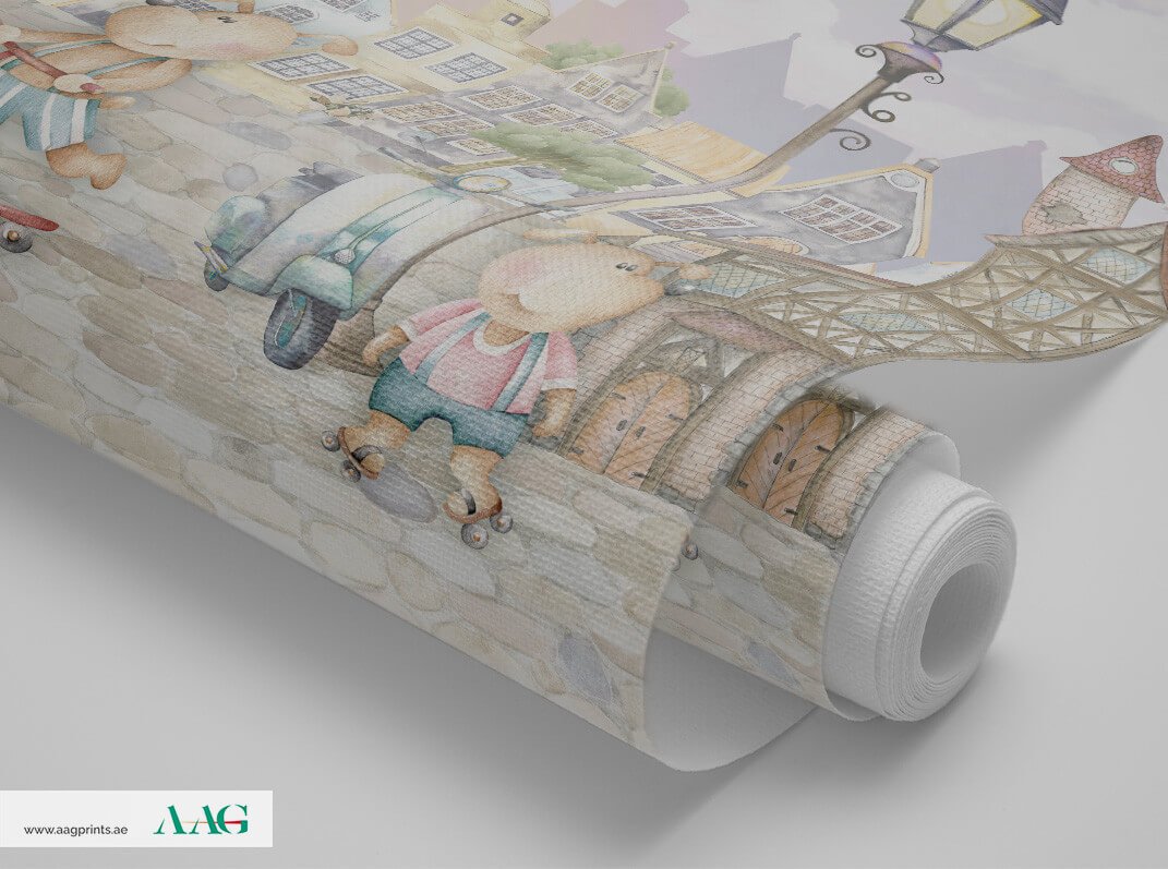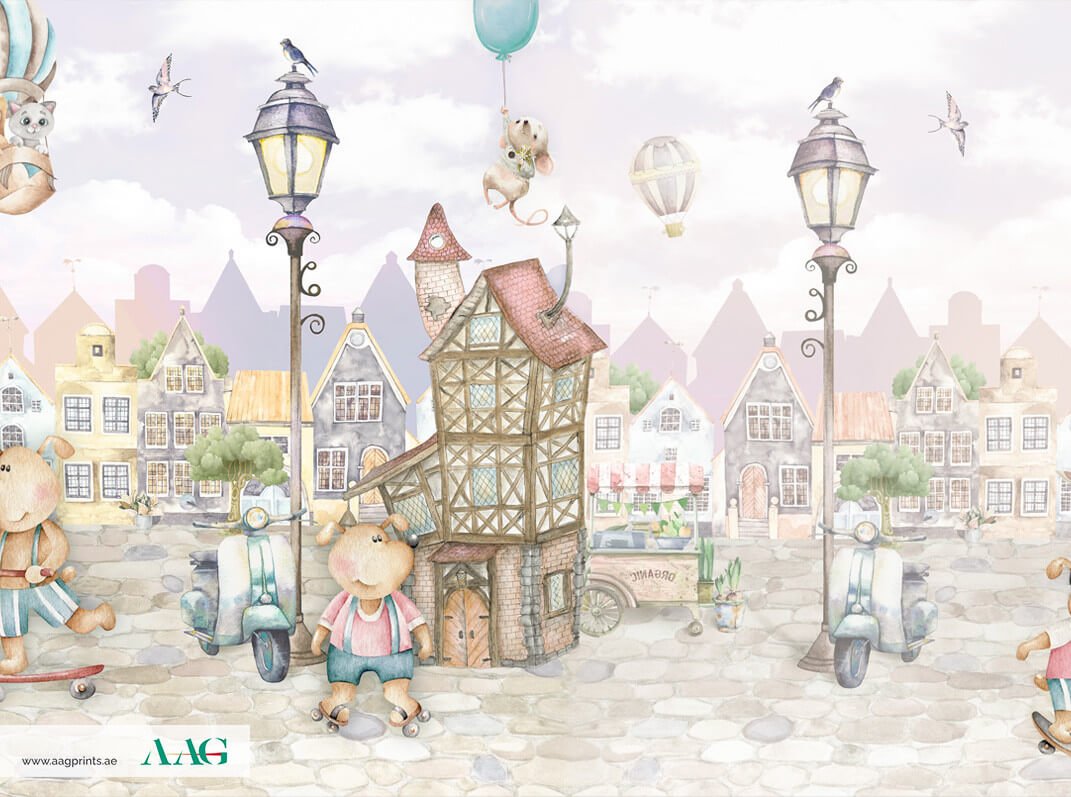 In this charming panoramic artwork, anthropomorphic animal creatures bustle around a fanciful European city, complete with well-known landmarks like the Eiffel Tower. As pigs and pandas ride bicycles, scooters, and skateboards on a cobblestone street, hot air balloons, kites, and even flying mice glide across a gentle, pastel-hued sky, creating a whimsical and imaginative urban scene.