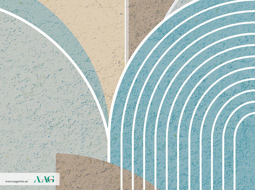 A calm and contemporary abstract landscape with depth is produced by a calming blending of muted tones, gentle blues, and beiges in layered arch forms.