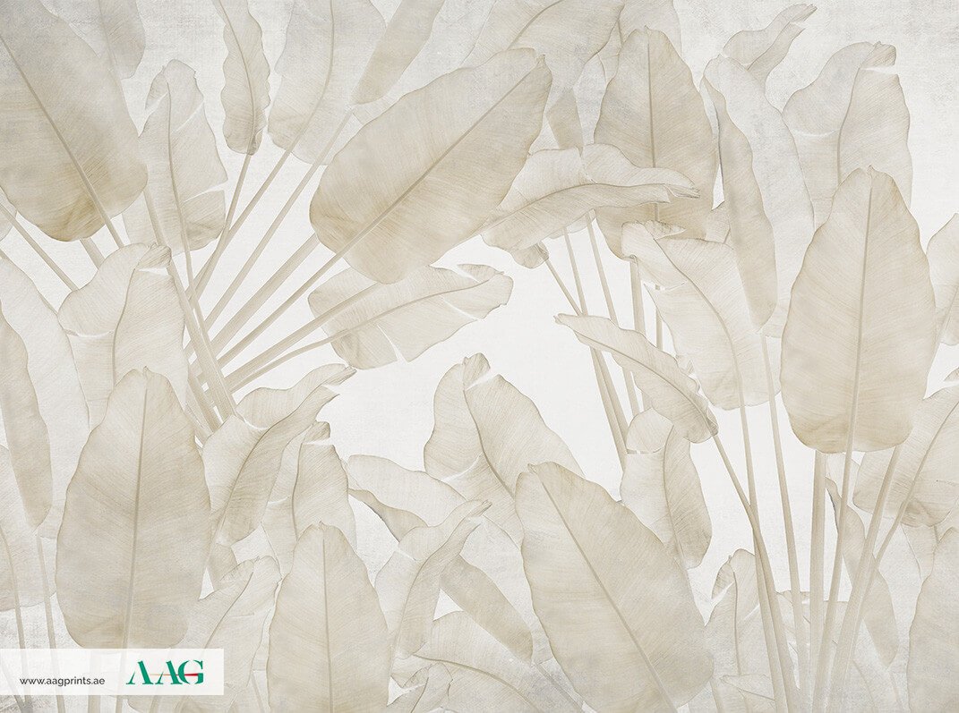 Large, transparent plant leaves that resemble banana or palm fronds are shown in this image's calm, abstract composition using gentle, subdued light beige and cream hues. A serene and spacious natural retreat is evoked by the layered impression created by the overlapping foliage, which has delicate depth and varied opacities.
