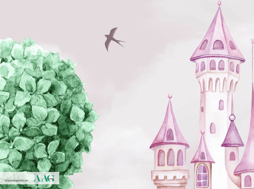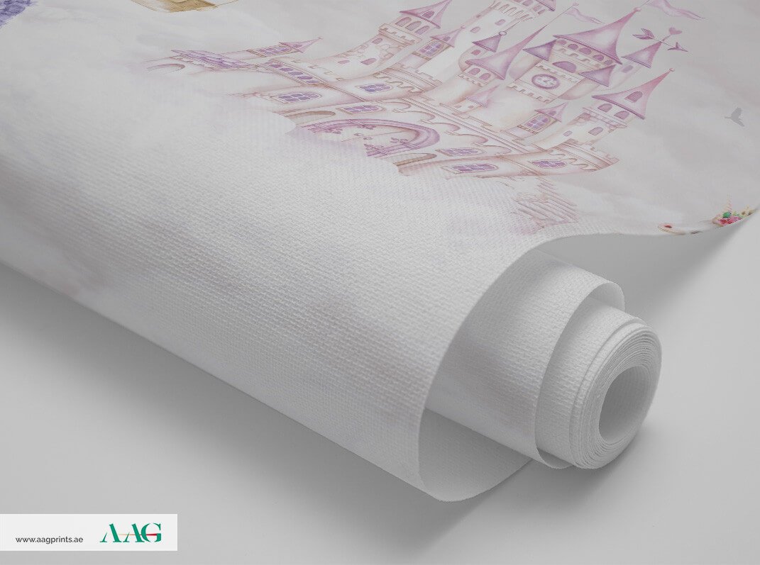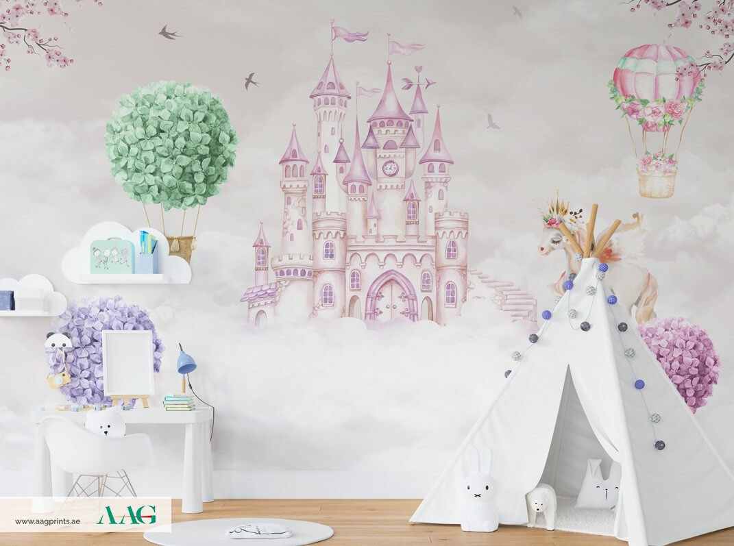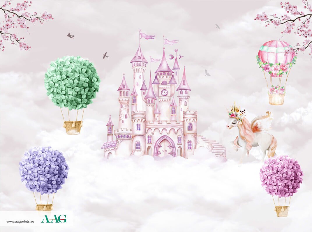 A charming fairy-tale world is created as a beautiful pink castle floats amid gentle clouds, encircled by enchanted hot air balloons and blossoming cherry blossoms.