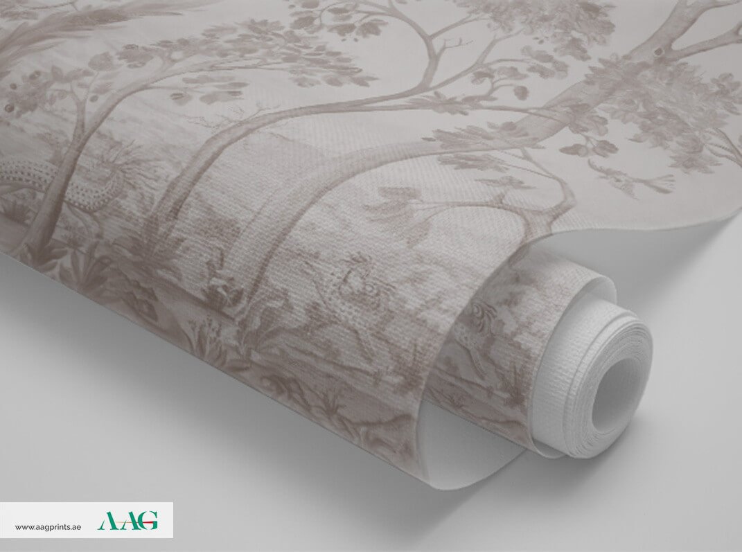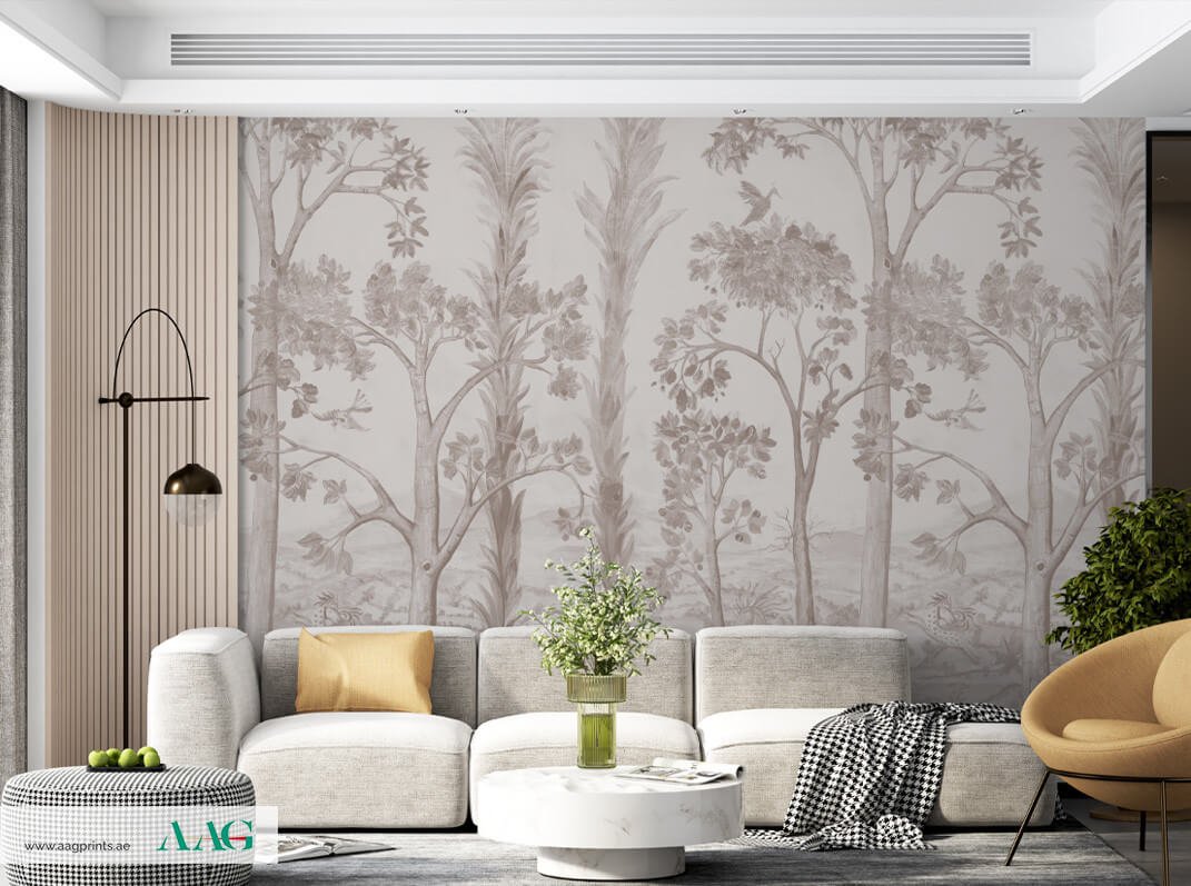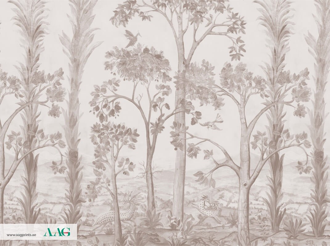 On a light background, this elaborate piece of art depicts a beautiful woodland landscape in subdued sepia tones. The foreground is dominated by tall, lean trees with a variety of foliage, inhabited by little birds sitting on their branches and fanciful animals that resemble deer playing close to the base. Behind the thick forest, a faint hilly or far-off tree scape emerges, forming a peaceful and captivating natural scene.