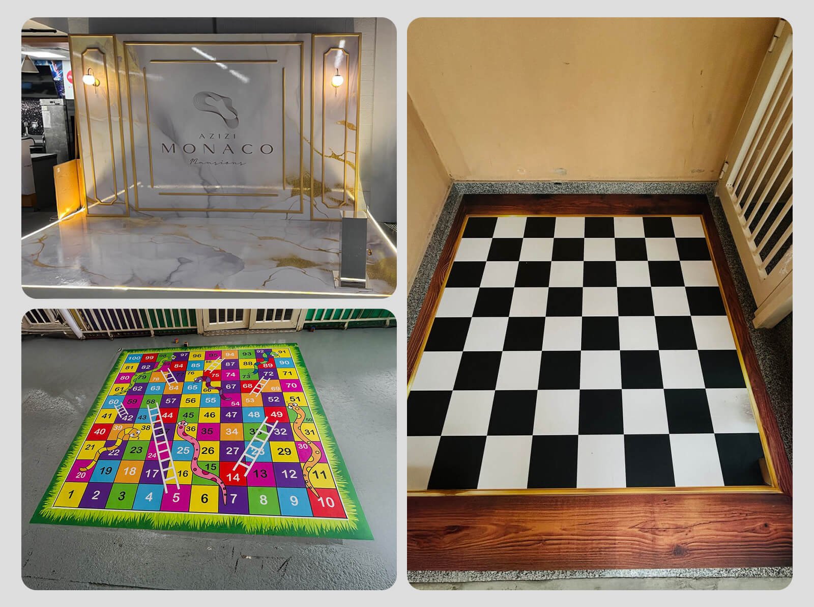 Floor graphics are custom designs printed either on premium vinyl sticker with floor lamination or pvc carpet with customized designs that are applied directly to the floor surface for advertising, branding, or decorative purposes.