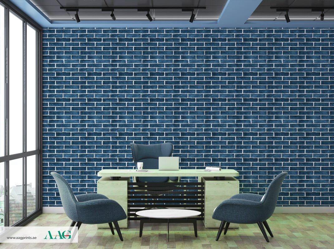 This picture shows a full-frame, close-up of a brick wall with rectangular bricks that are a deep, rich shade of blue. The contrasting white or light-coloured mortar lines that produce a grid-like appearance across the surface highlight the bricks' unique shape, which is set in a classic stretcher bond pattern. The wall has a contemporary yet timeless appearance due to the bricks' smooth texture with minor differences.