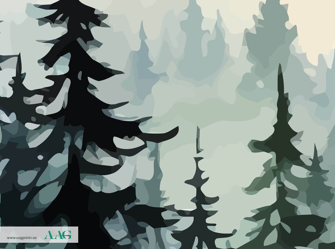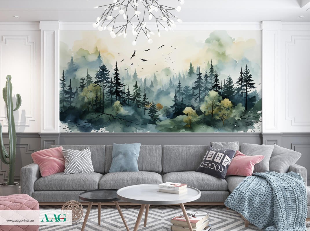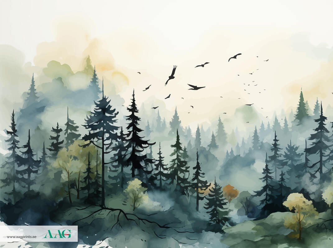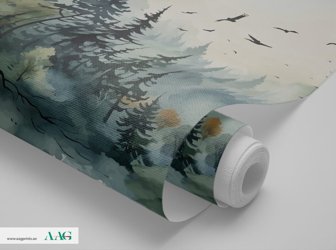 Enhance your area with " Misty Forest Dawn" creative beauty. This wallpaper depicts a deep woodland in a painterly manner, with the unique watercolour brushstrokes and flowing hues producing a surreal scene. Dark evergreens, misty blues, and faint autumnal undertones combine to create a sophisticated yet natural background that is perfect for art enthusiasts and contemporary home design.