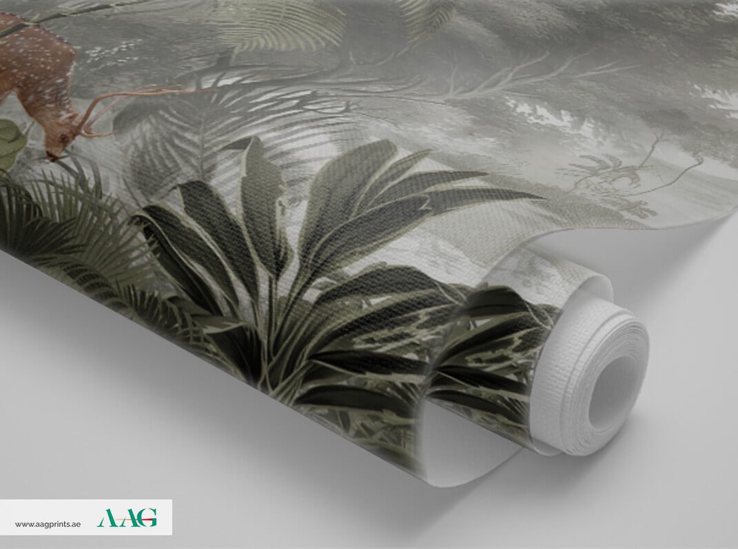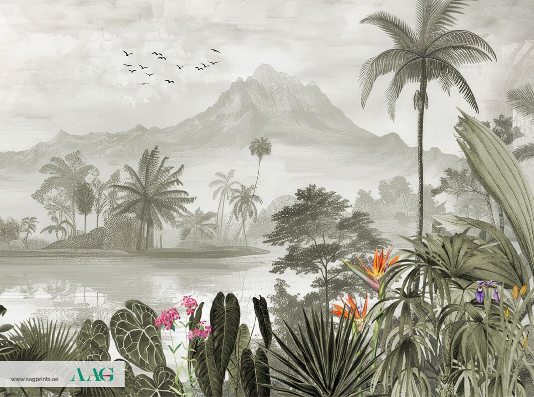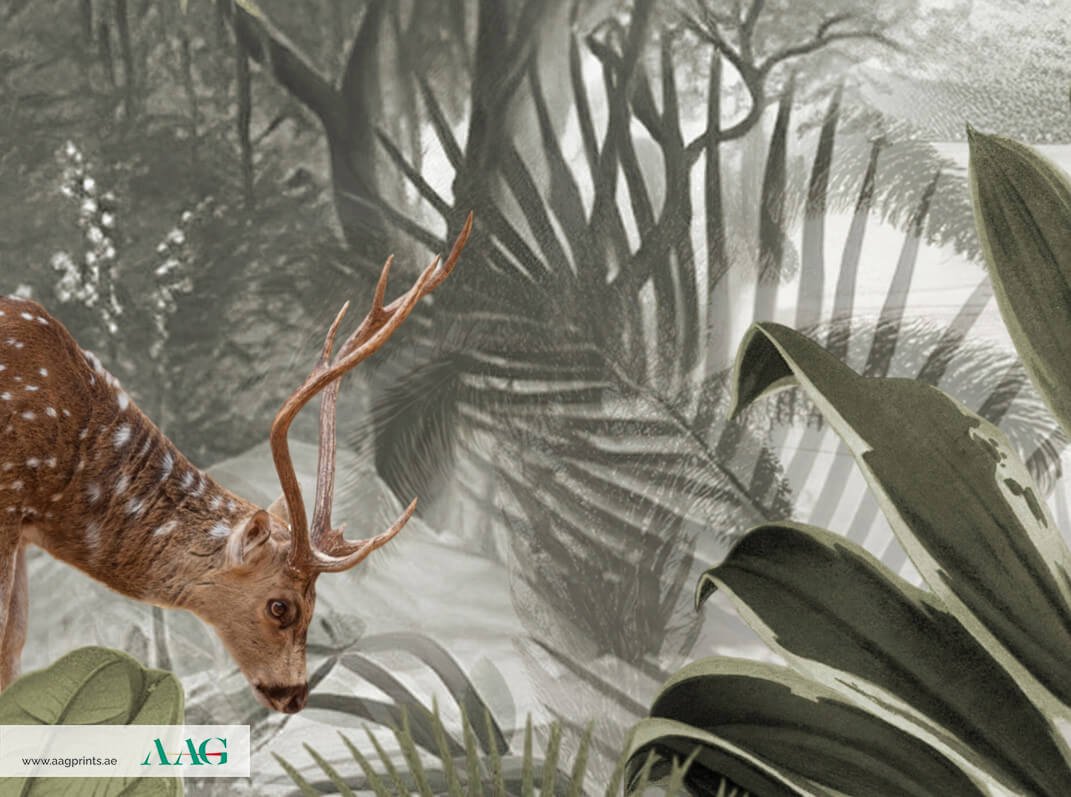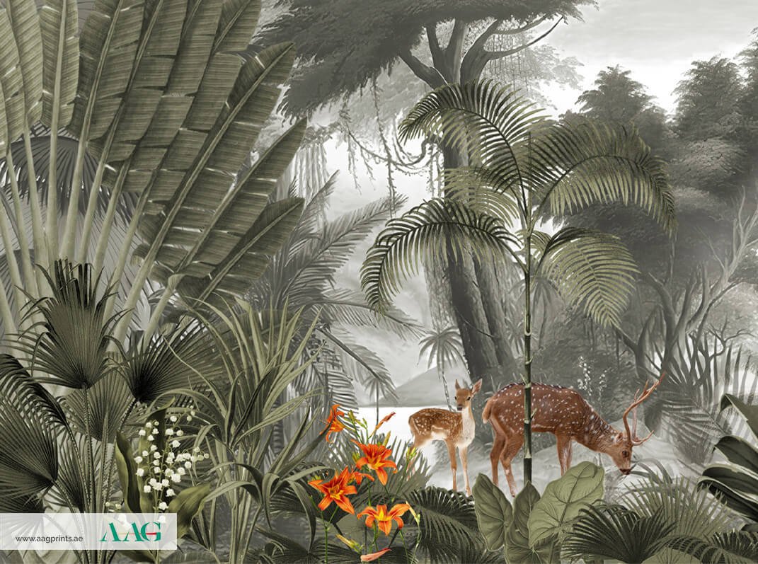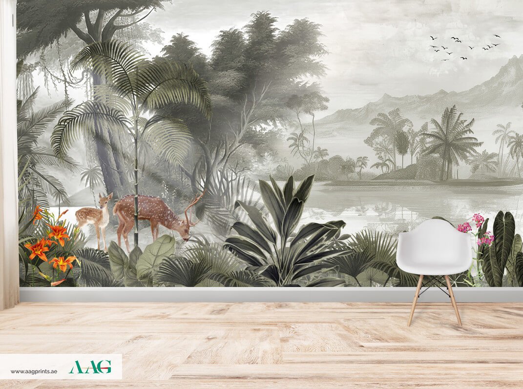 This large mural depicts a calm and foggy jungle scene, mostly in grey tones, with faint orange and purple accents from tropical flowers. Two deer delicately drink from a placid pool of water in the foreground, which is filled with lush, intricate flora. Magnificent mountains appear in the distance, covered in fog, beneath a sky full of birds, evoking a serene sense of the natural world.