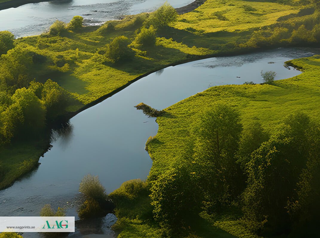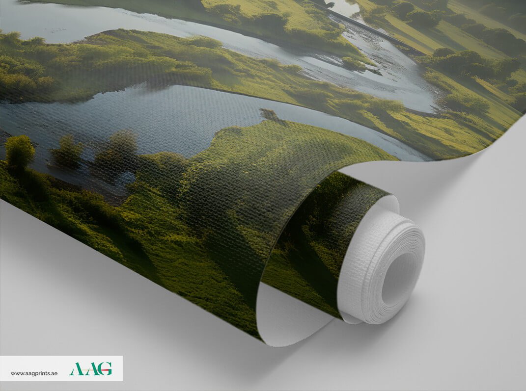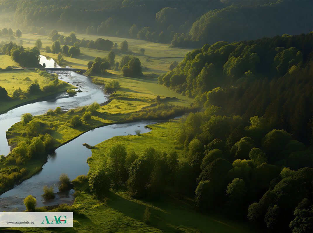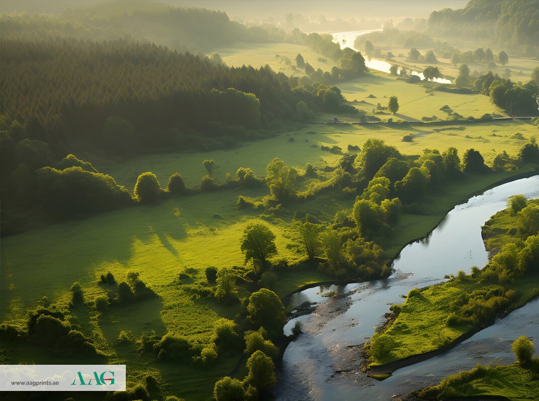Bring some new peace and quiet to your area with "Morning Dew River." The gentle, enlightening light of a spring morning, which casts a golden glow over a tranquil river and its lush green surrounds, is beautifully captured in this wallpaper. Perfect for bringing natural beauty, tranquillity, and a sense of rebirth into your house or place of business.