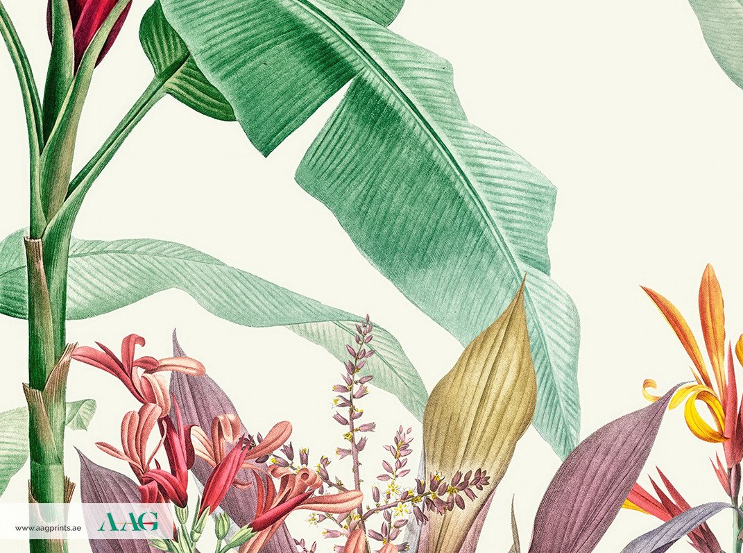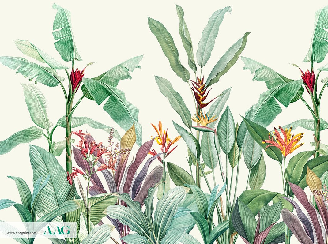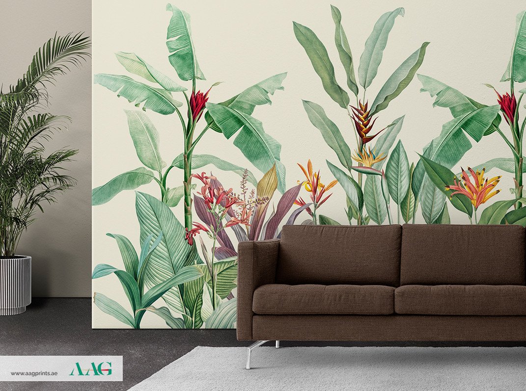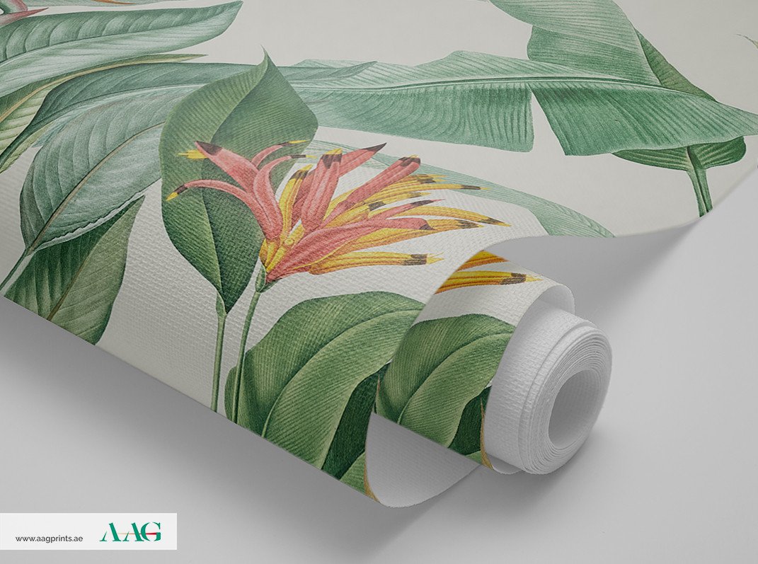 Bring the lush beauty of the tropics indoors. This wallpaper features a vibrant array of banana leaves, heliconias, and exotic foliage in rich greens and reds, creating a lively and immersive jungle escape.