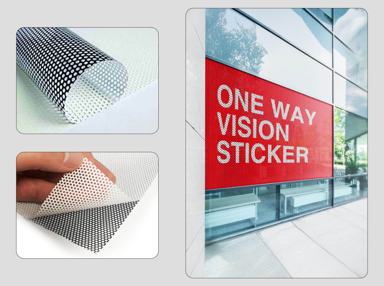 One-way vision stickers are made from a perforated vinyl material. This material has small holes or perforations that create a see-through effect. From the inside, the holes are small enough to maintain the appearance of a solid image, but from the outside, people can see through the holes, allowing for visibility.