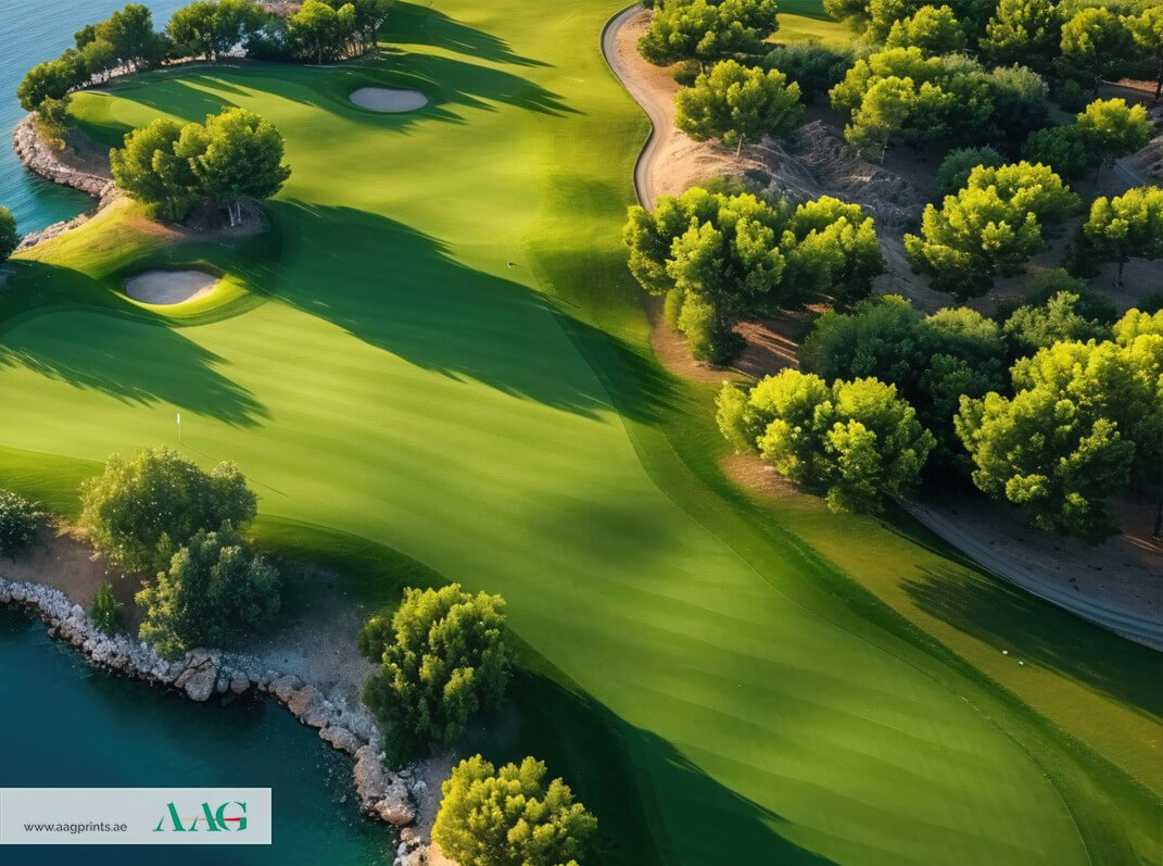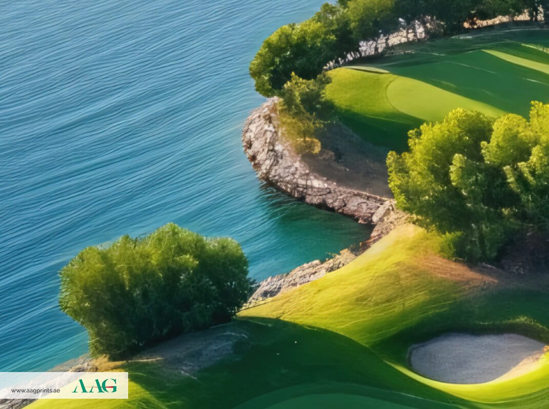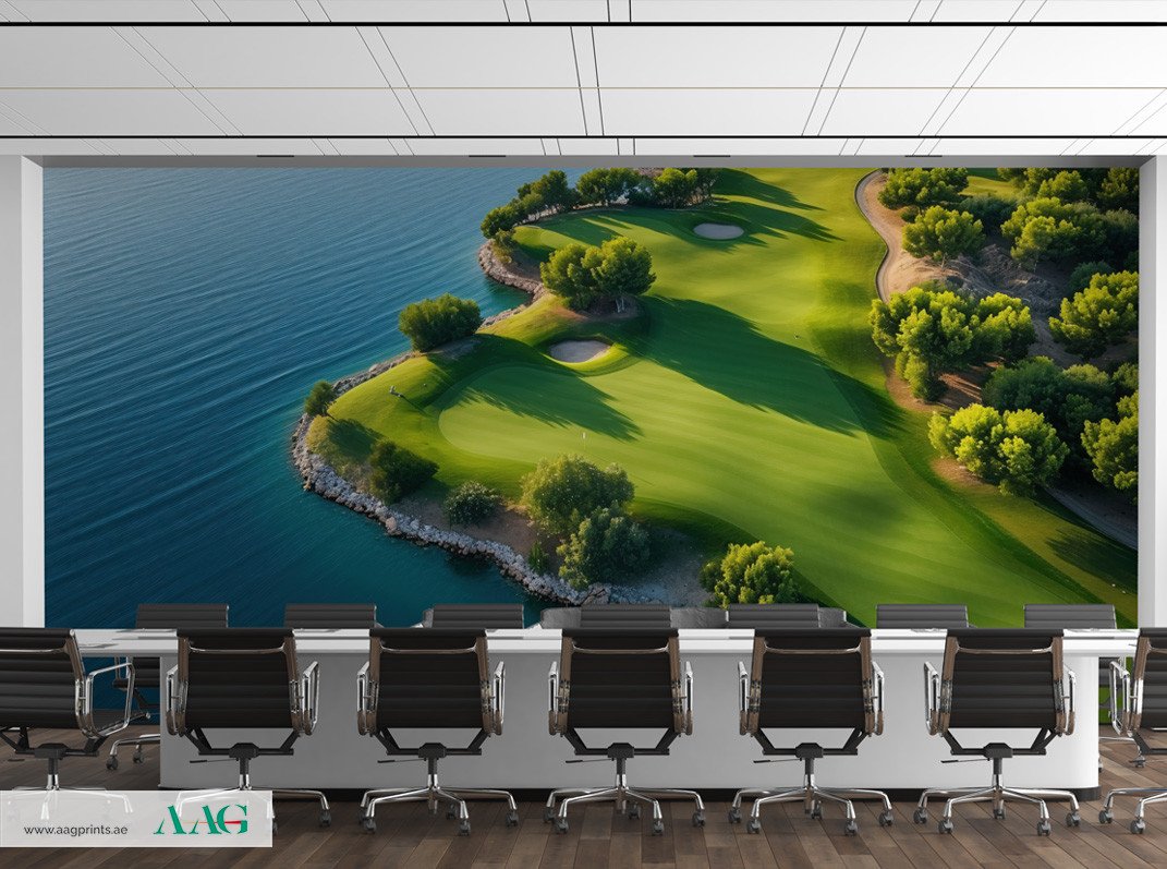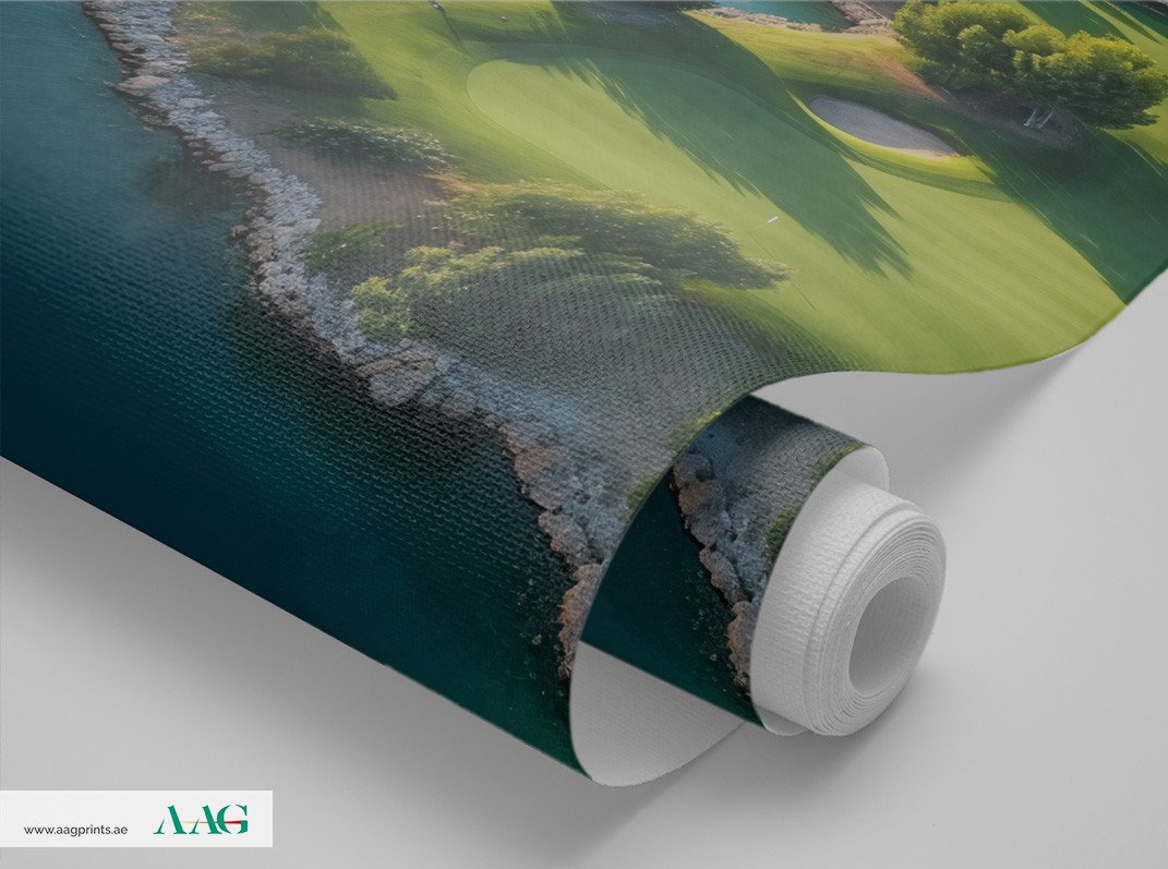 Savour the tranquil splendour of "Coastal Greens Oasis." Set against the glistening blue waves of a shoreline, this gorgeous wallpaper depicts an exquisite aerial view of a well-kept golf course. The vivid greens and enticing blues create an atmosphere of luxury, relaxation, and peaceful retreat, making them ideal for adding a chic, serene view to any space.