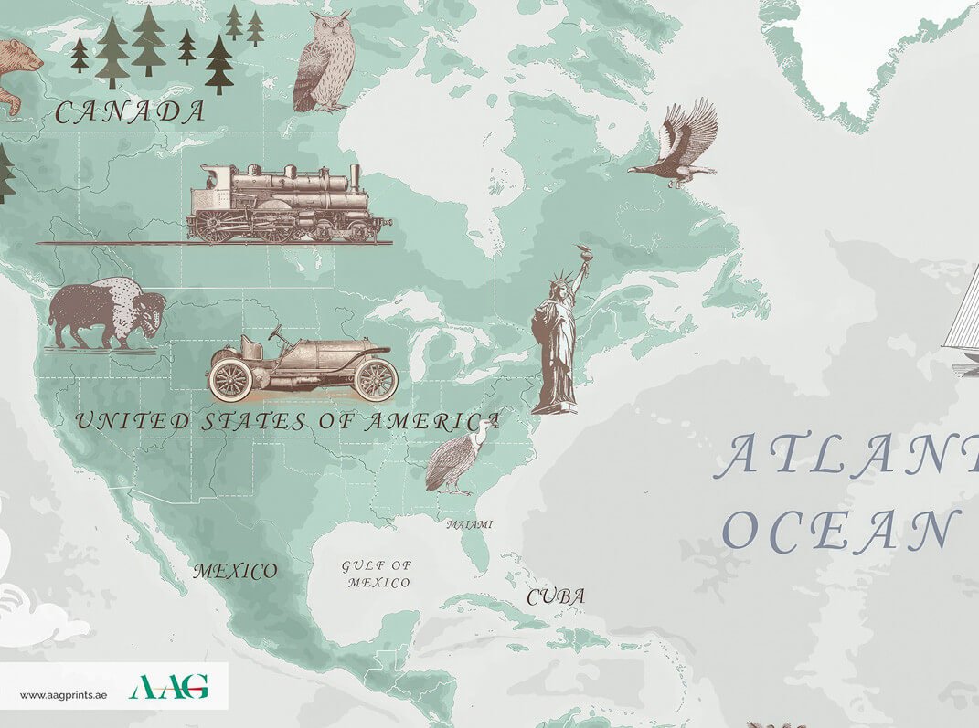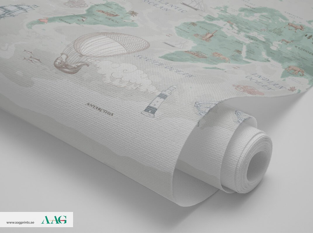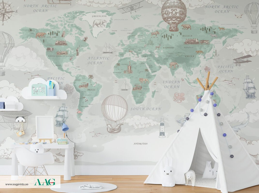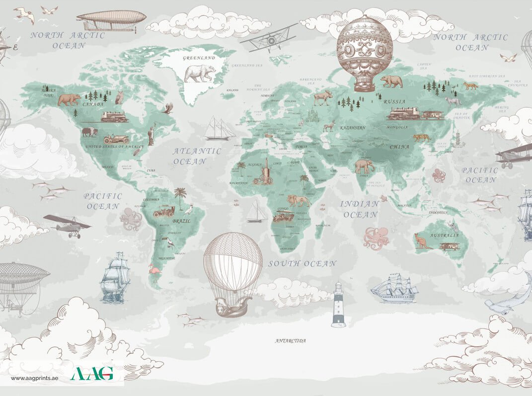 This elegantly rendered world map, presented in a muted, vintage-inspired palette, evokes a sense of classic adventure. The seas are identified, while the continents are tinted a gentle green-blue. Richly detailed line drawings of hot air balloons, biplanes, sailing ships, historical sites, and natural elements from all over the world adorn it. The classic, exploring motif is enhanced with fluffy clouds and a compass rose, creating a refined yet playful artwork for a child's room or study.