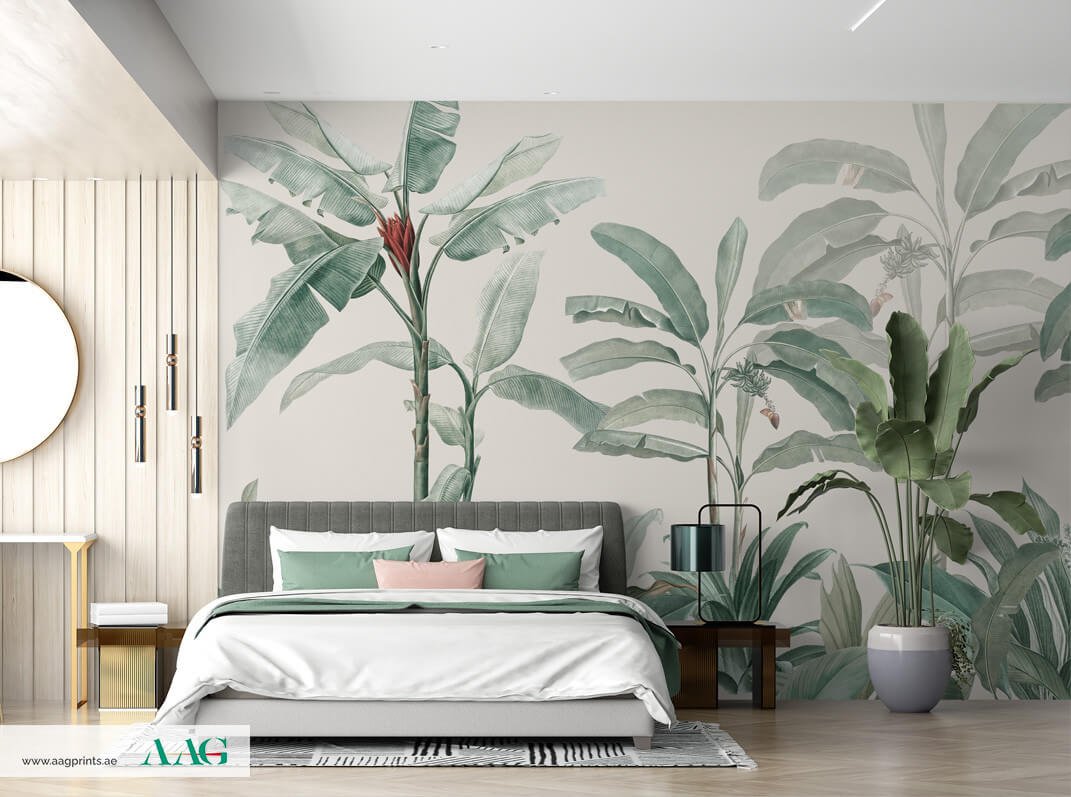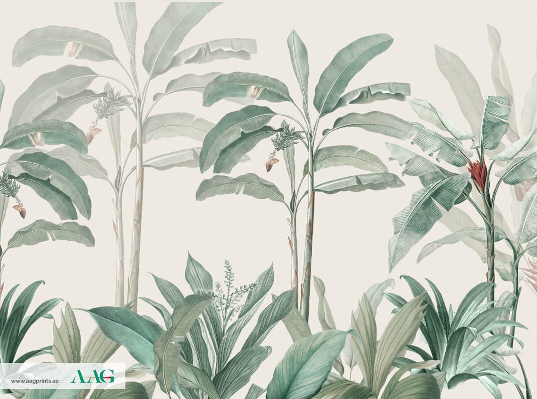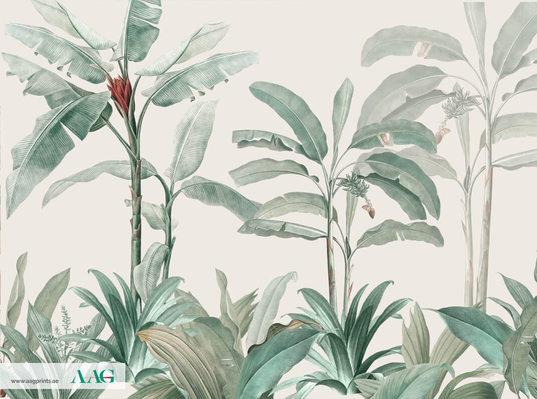 Tall banana plants and lush, broad-leaved foliage occupy the foreground in this botanical picture, which depicts a tranquil tropical environment. The image portrays a tranquil and bountiful natural setting on a light, neutral background, with gentle colours of subdued green and faint touches of red.