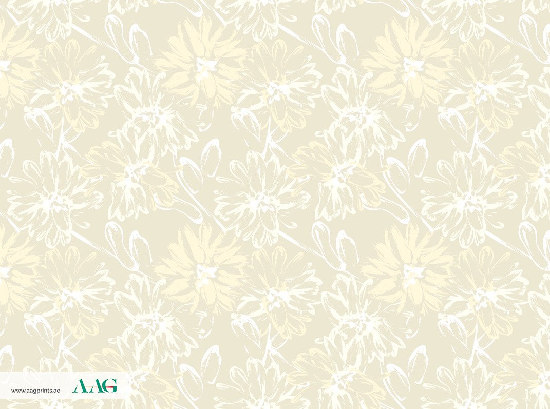 In colours of milky white and mild yellow, stylized flower patterns that resemble loosely drawn daisies or chrysanthemums are featured in this gentle, recurring design. A delicate and subtle design is created on a warm, light beige backdrop thanks to the creative brushstrokes used to represent the blooms and the accompanying leaf-like forms.