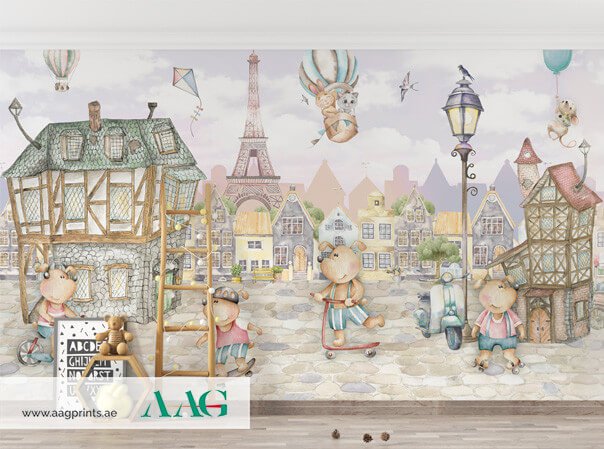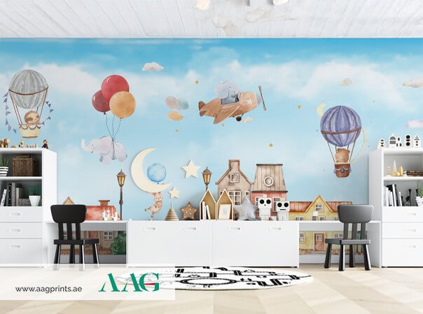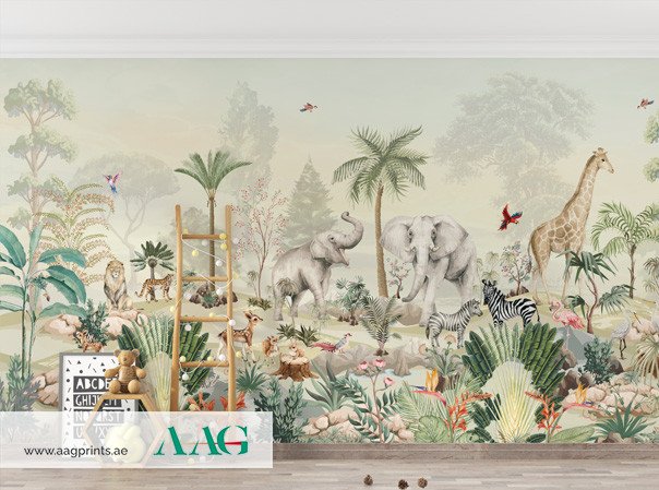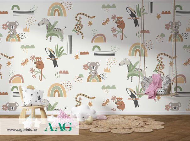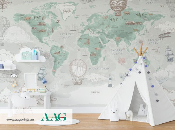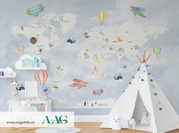 This colorful wallpaper is ideal for encouraging global exploration and education in a child's room because it features a nice painted world map with amusing animals and locations.